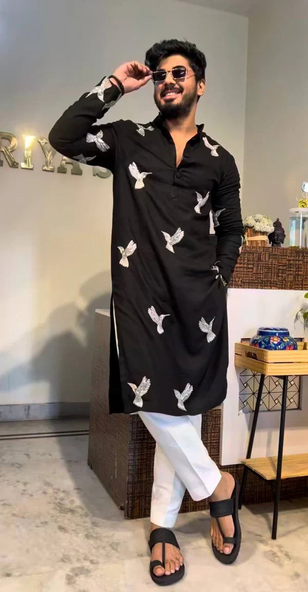 BLACK NECK BIRDS EMBROIDERED WORK MENāS KURTA WITH PAJAMA