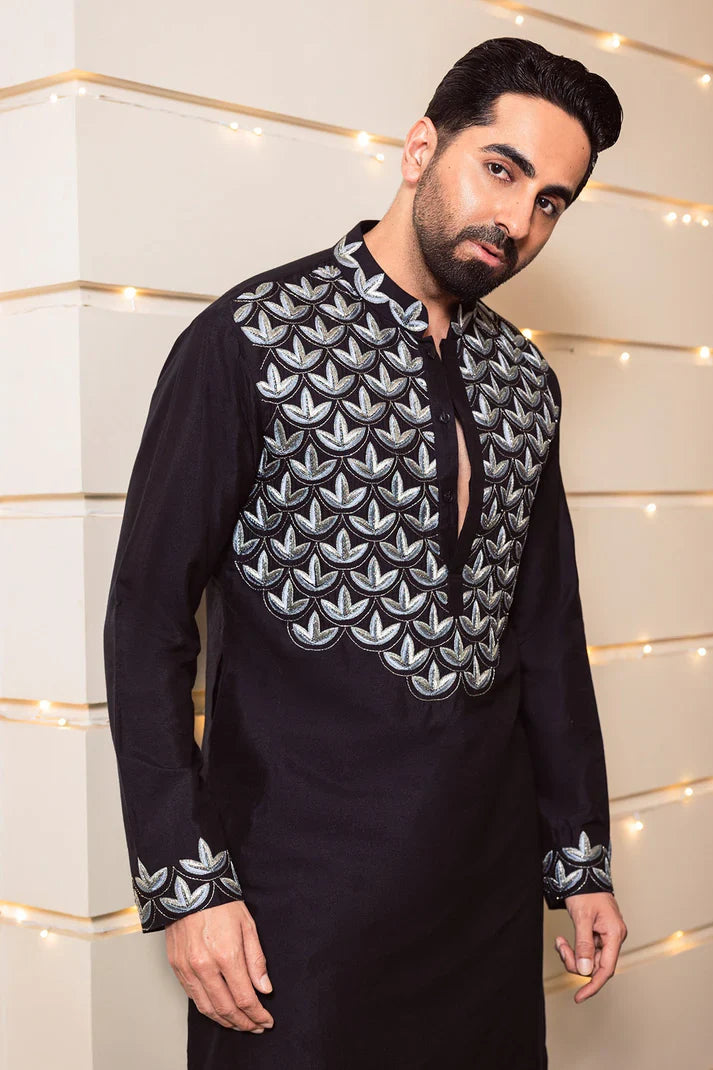 This Black Leaf Embroidered Men's Kurta with Pajama Is Created by Tatvam Kurta,This Hand-stitched Kurta Is Made of 100% Pure Cotton Fabric With Having Hand Work Over It. Our Attractive embroidery Add More Charm to Your Look, Wear This at Any Time Because the Fabric Is So Smooth to Skin That You Will Love It.