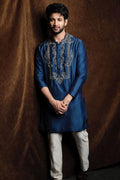 This Blue Jari Neck Satin Embroidered Work Men's Kurta with Pajama Is Created by Tatvam Kurta ,This Hand-stitched Kurta Is Made of 100% Fabric With Having embroidered work Over It. Our Attractive embroidery Add More Charm to Your Look, Wear This at Any Time Because the Fabric Is So Smooth to Skin That You Will Love It.
