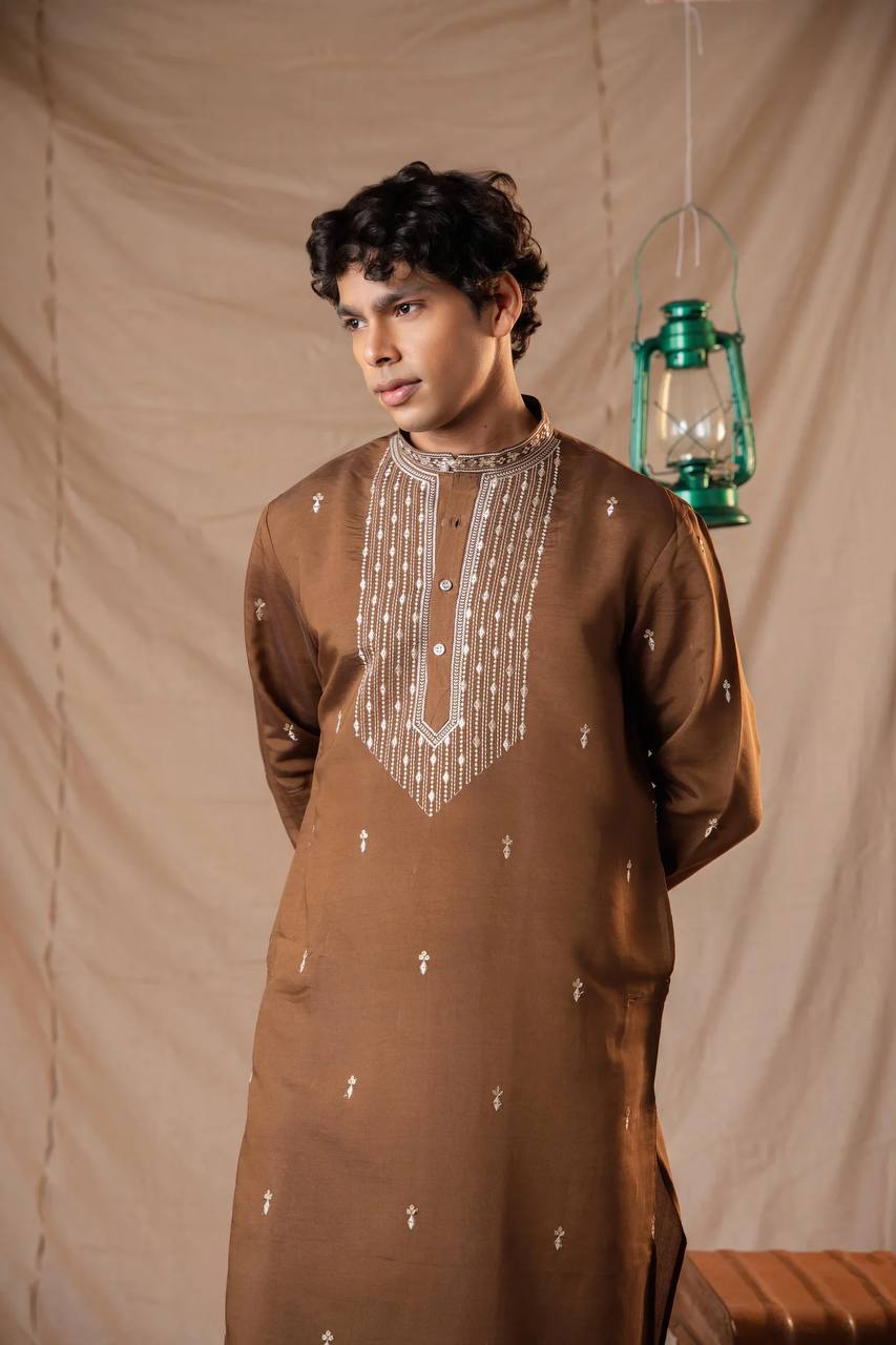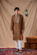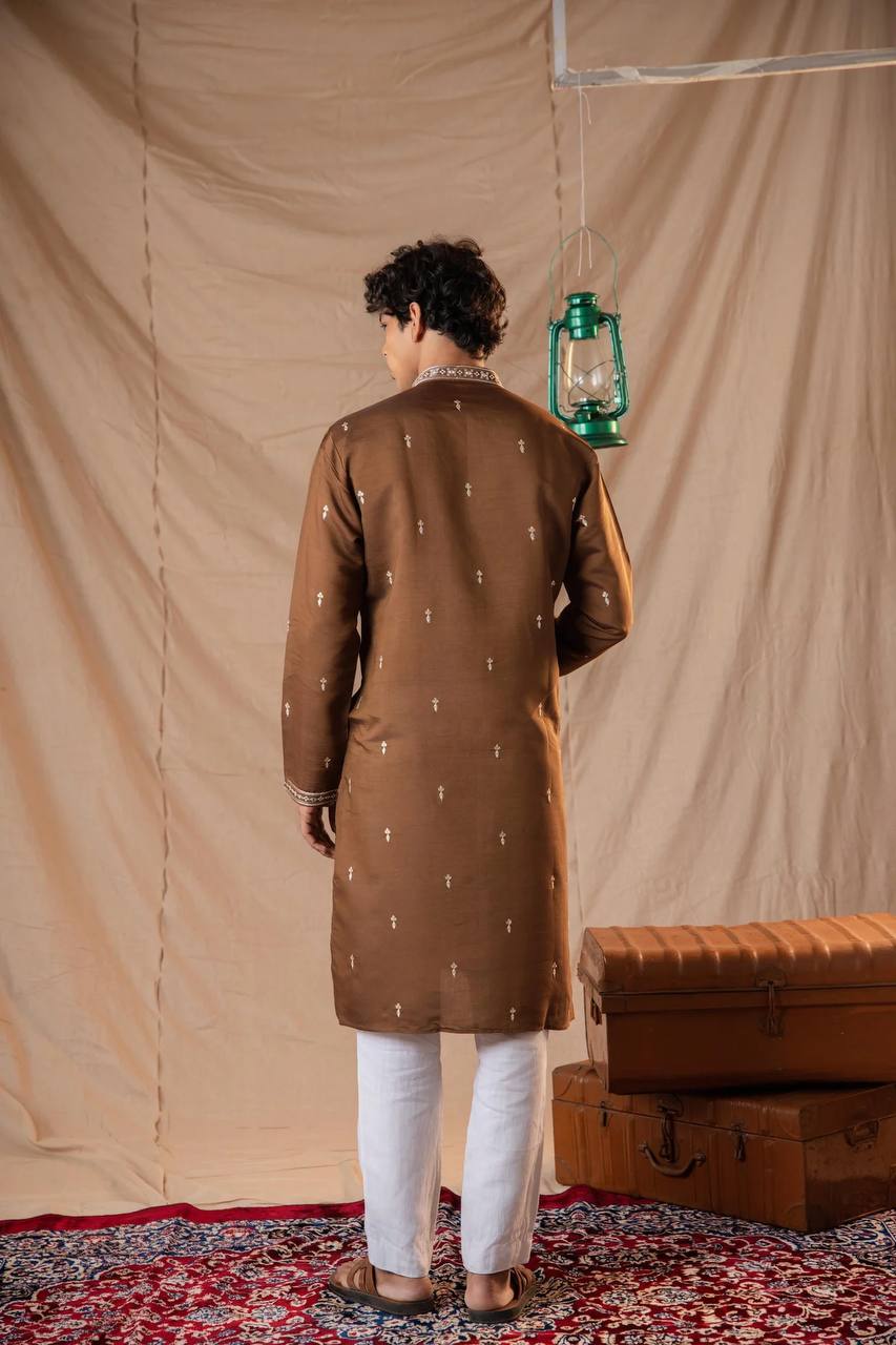 This Brown Sequence Neck Embroidered Work Men's Kurta with Pajama Created by Tatvam Kurta ,This Hand-stitched Kurta Is Made of 100% Pure Cotton Fabric With Having embroidered work Over It. Our Attractive embroidery Add More Charm to Your Look, Wear This at Any Time Because the Fabric Is So Smooth to Skin That You Will Love It.