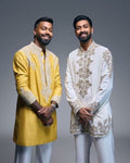 This Hp Yellow Dori Work Embroidered Work Men's Kurta with Pajama Is Created In Tatvam Kurta ,This Hand-stitched Kurta Is Made of 100% Pure Malay satin with Fusing Fabric With Having embroidered work Over It. Our Attractive embroidery Add More Charm to Your Look, Wear This at Any Time Because the Fabric Is So Smooth to Skin That You Will Love It.