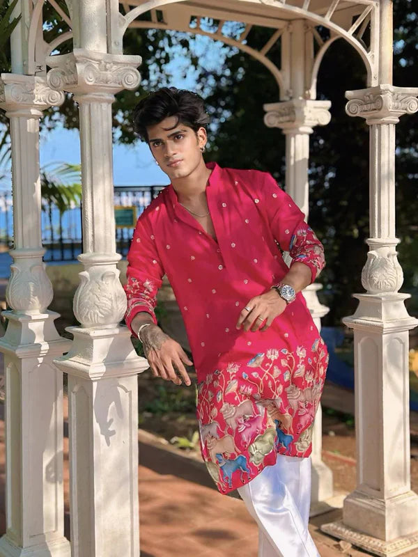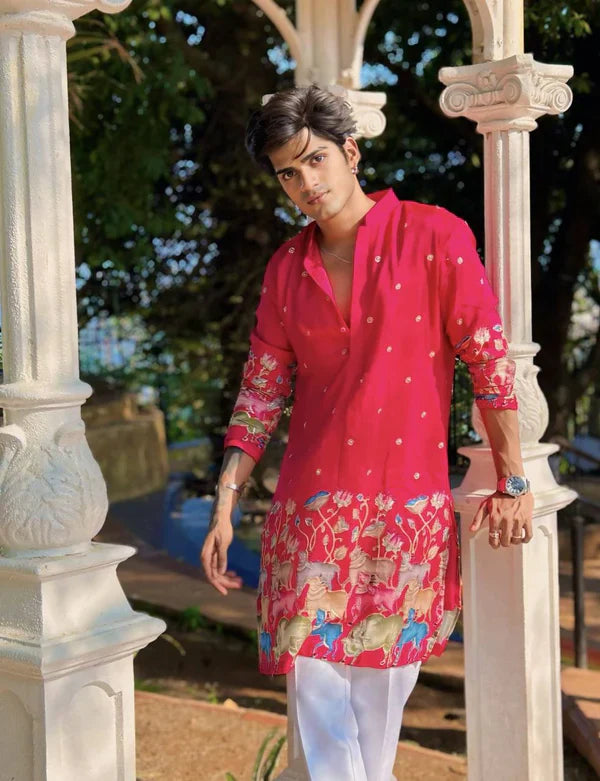 This Pink Cow N Lotus Printed Kurta With Pajama Is Created by Tatvam Kurta ,This full stitched Kurta Is Made of 100% Pure Cotton Fabric With Having Hand digital Printed Prints Over It. Our Attractive Prints Add More Charm to Your Look, Wear This at Any Time Because the Fabric Is So Smooth to Skin That You Will Love It.