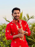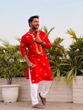 RED NECK MIRROR WORK EMBROIDERED KURTA PAJAMA SET FOR MEN'S