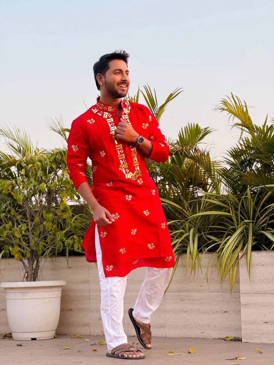 This Red Neck Mirror Embroidered Work Men's Kurta with Pajama Is Created byTatvam Kurta, This Hand-stitched Kurta Is Made of 100% Rayon Cotton (100% Cotton) 22kg Quality Fabric With Having embroidered work Over It. Our Attractive embroidery Add More Charm to Your Look, Wear This at Any Time Because the Fabric Is So Smooth to Skin That You Will Love It.