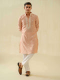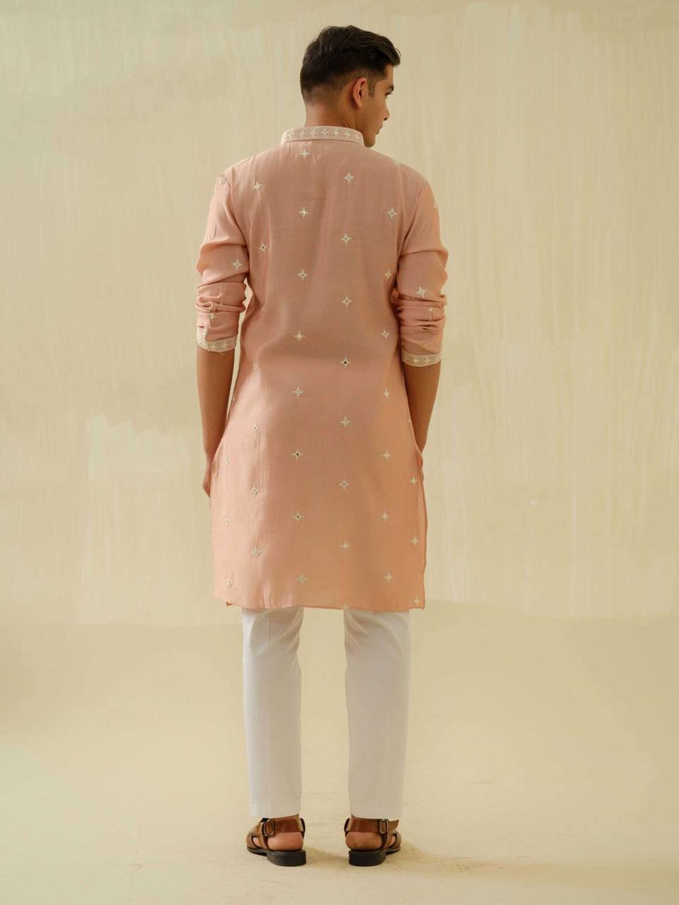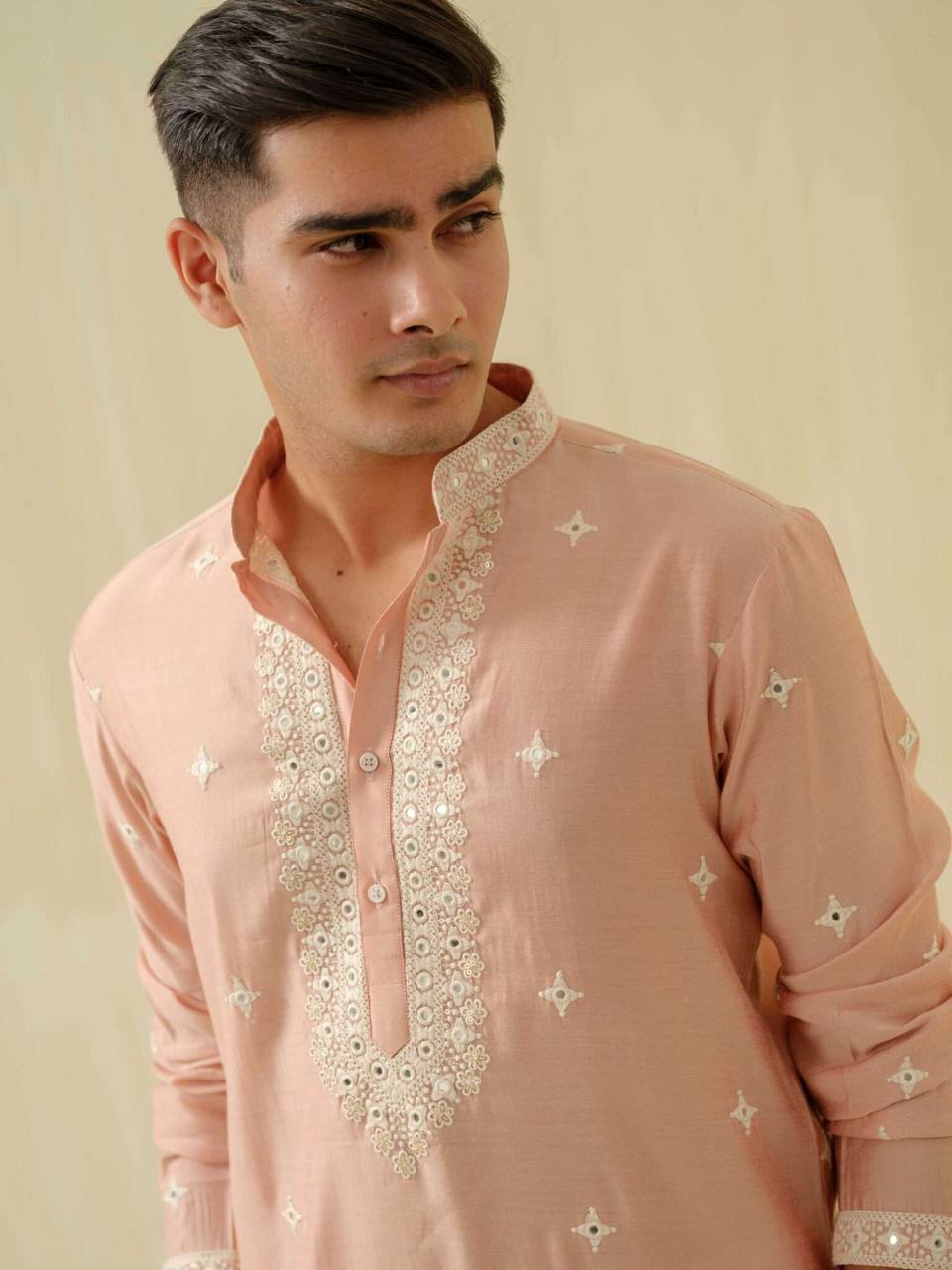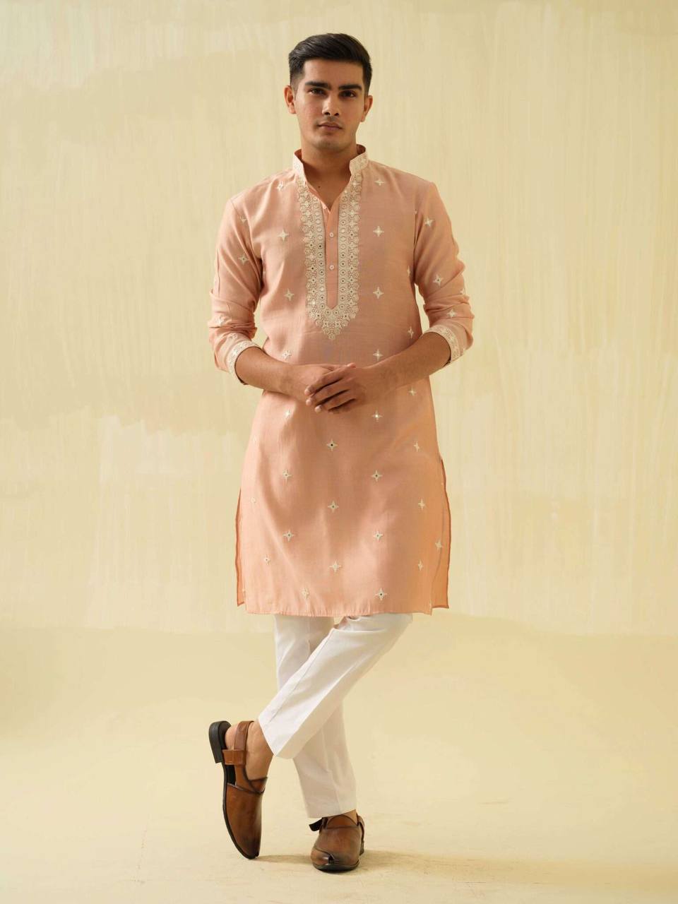 This Stylish Peach Mirror Work Embroidered Work Men's Kurta with Pajama Is Created In Tatvam Kurta With Having embroidered work Over It. Our Attractive embroidery Add More Charm to Your Look, Wear This at Any Time Because the Fabric Is So Smooth to Skin That You Will Love It.