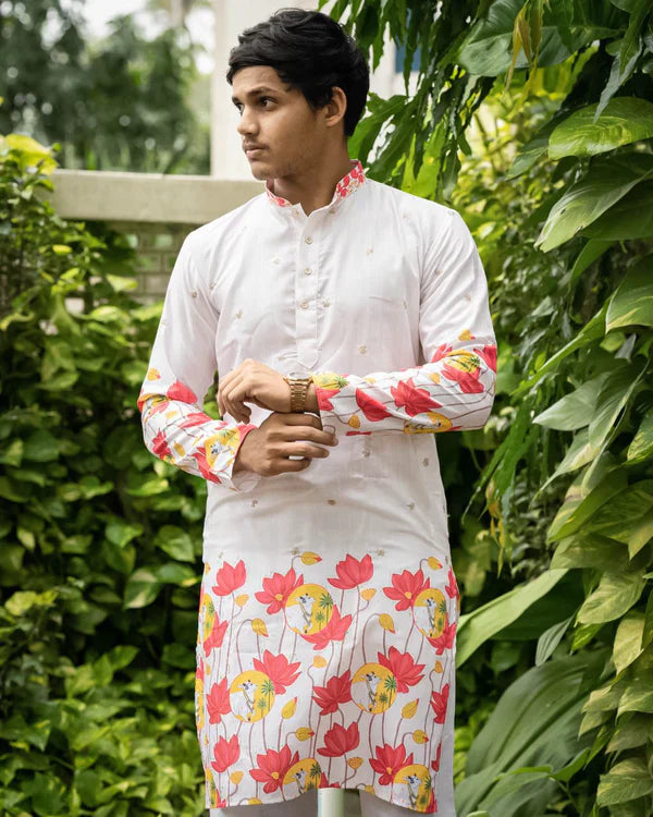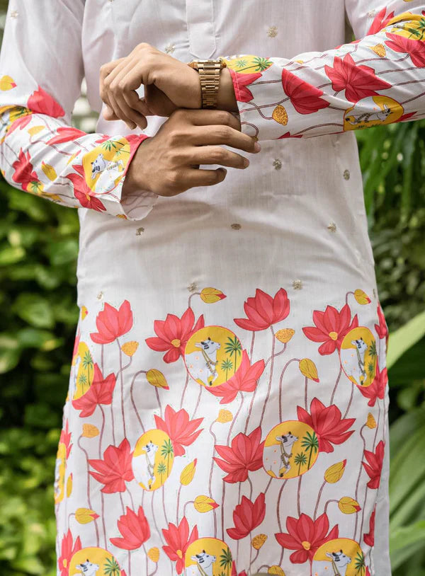 This white with cow Printed Kurta With Pajama Is Created by Tatvam Kurta ,This full stitched Kurta Is Made of 100% Pure Cotton Fabric With Having Hand digital Printed Prints Over It. Our Attractive Prints Add More Charm to Your Look, Wear This at Any Time Because the Fabric Is So Smooth to Skin That You Will Love It.