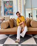 This YELLOW Neck and jari Embroidered Work Men's Kurta with Pajama Is Created by Tatvam Kurta ,This Hand-stitched Kurta Is Made of 100% Pure Rayon Cotton ( 22kg ) Fabric With Having embroidered work Over It. Our Attractive embroidery Add More Charm to Your Look, Wear This at Any Time Because the Fabric Is So Smooth to Skin That You Will Love It.