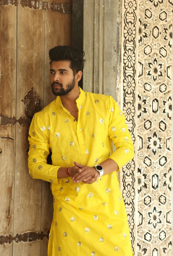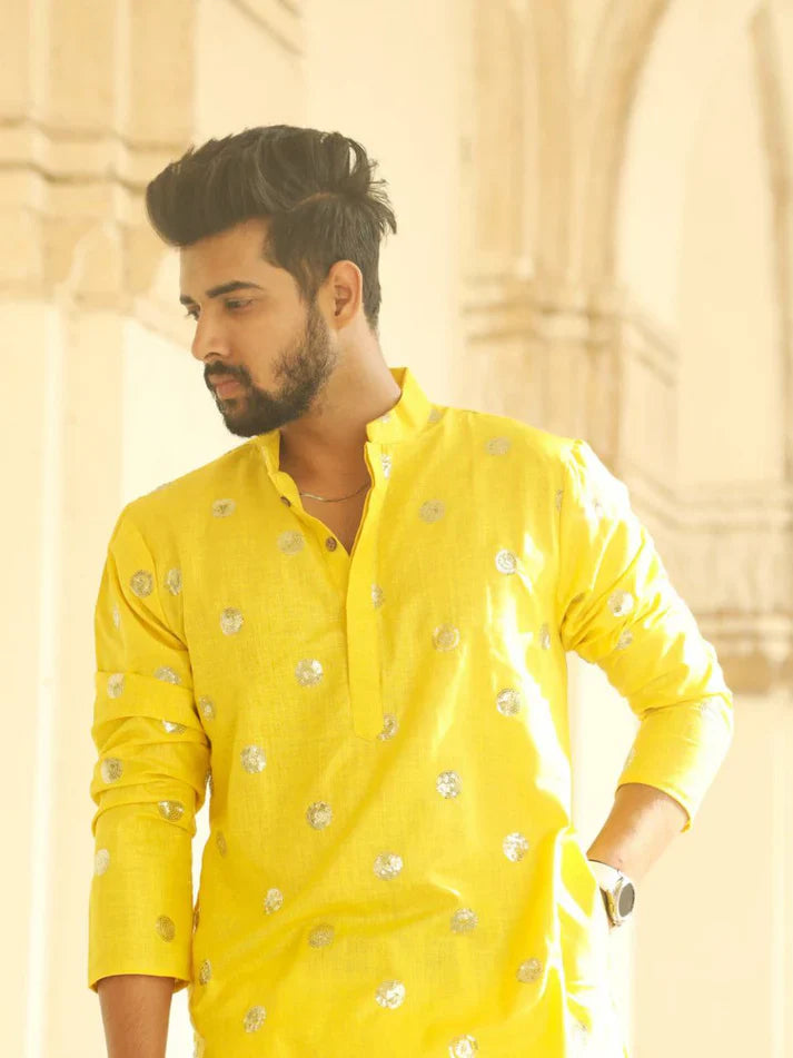 This Yellow Sequence Embroidered Work Men's Kurta with Pajama Is Created by Tatvam Kurta,This Hand-stitched Kurta Is Made of 100% Pure Cotton Fabric With Having embroidered work Over It. Our Attractive embroidery Add More Charm to Your Look, Wear This at Any Time Because the Fabric Is So Smooth to Skin That You Will Love It.